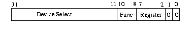 So that the CPU's PCI initialization code can address devices that are not on the main PCI bus, there has to be a mechanism that allows bridges to decide whether or not to pass Configuration cycles from their primary interface to their secondary interface. A cycle is just an address as it appears on the PCI bus. The PCI specification defines two formats for the PCI Configuration addresses; Type 0 and Type 1; these are shown in Figure  6.3 and Figure  6.4 respectively. Type 0 PCI Configuration cycles do not contain a bus number and these are interpretted by all devices as being for PCI configuration addresses on this PCI bus. Bits 31:11 of the Type 0 configuraration cycles are treated as the device select field. One way to design a system is to have each bit select a different device. In this case bit 11 would select the PCI device in slot 0, bit 12 would select the PCI device in slot 1 and so on. Another way is to write the device's slot number directly into bits 31:11. Which mechanism is used in a system depends on the system's PCI memory controller.