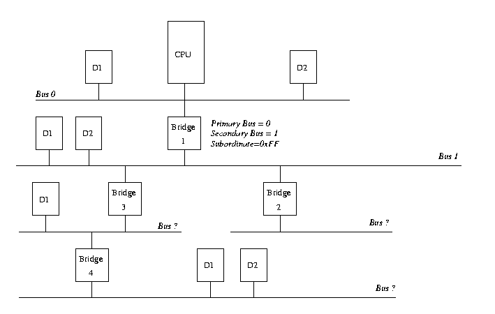Taking the topology in Figure  6.6, the first bridge the scan would find is Bridge1. The PCI bus downstream of Bridge1 would be numbered as 1 and Bridge1 assigned a secondary bus number of 1 and a temporary subordinate bus number of 0xFF. This means that all Type 1 PCI Configuration addresses specifying a PCI bus number of 1 or higher would be passed across Bridge1 and onto PCI Bus 1. They would be translated into Type 0 Configuration cycles if they have a bus number of 1 but left untranslated for all other bus numbers. This is exactly what the Linux PCI initialisation code needs to do in order to go and scan PCI Bus 1.