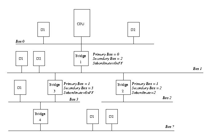 The problem is that at the time when you wish to configure any given PCI-PCI bridge you do not know the subordinate bus number for that bridge. You do not know if there are further PCI-PCI bridges downstream and if you did, you do not know what numbers will be assigned to them. The answer is to use a depthwise recursive algorithm and scan each bus for any PCI-PCI bridges assigning them numbers as they are found. As each PCI-PCI bridge is found and its secondary bus numbered, assign it a temporary subordinate number of 0xFF and scan and assign numbers to all PCI-PCI bridges downstream of it. This all seems complicated but the worked example below makes this process clearer.